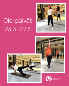 Tervetuloa mukaan iloiseen tapahtumaan Ololle! Olo-päivien aikana mm. spesiaaliohjelmaa ryhmäliikunnassa, kiinnostavia workshopeja, tuote-esittelyitä ja tarjouksia.